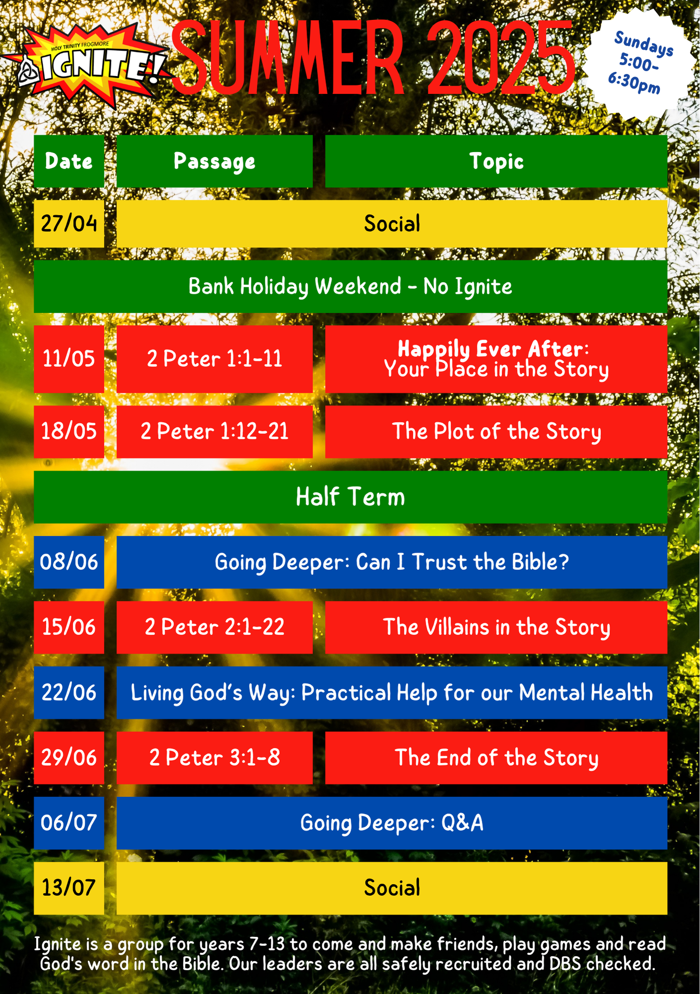 Ignite is our youth group for those in school years 7-13. We meet from 5-6:30pm in the church hall for games, snacks and bible teaching.